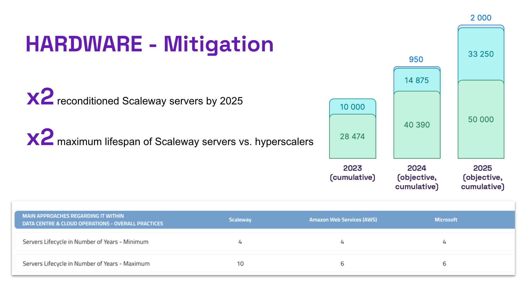 When it comes to the cloud, those CSPs who make their servers last the longest do the most to reduce their hardware impact. Whereas previously, most data center servers were binned after 3-4 years, some hyperscalers can now go for four to six years (cf. table below, from AdVaes), Scaleway makes its servers last for ten years and beyond, thanks to programs such as Transformers (below, and more info here).