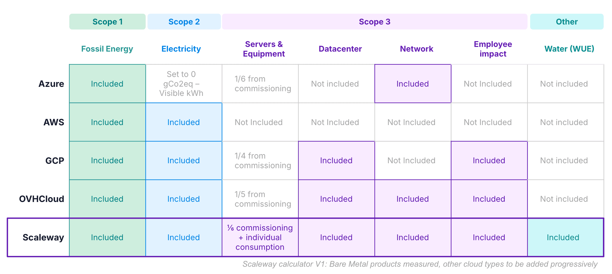 What can your cloud provider do on this front? It can and should provide software that enables you to measure the impact of your own cloud usage. This is precisely what Scaleway’s new Environmental Footprint Calculator (now in private beta) does, but in a more transparent and comprehensive way than other cloud calculators currently available (cf. above). Whilst others concentrate on carbon emissions, Scaleway’s will also cover water and hardware impact, and will be able to measure the latter in terms of individual hardware usage, rather than by applying average impacts across all users.