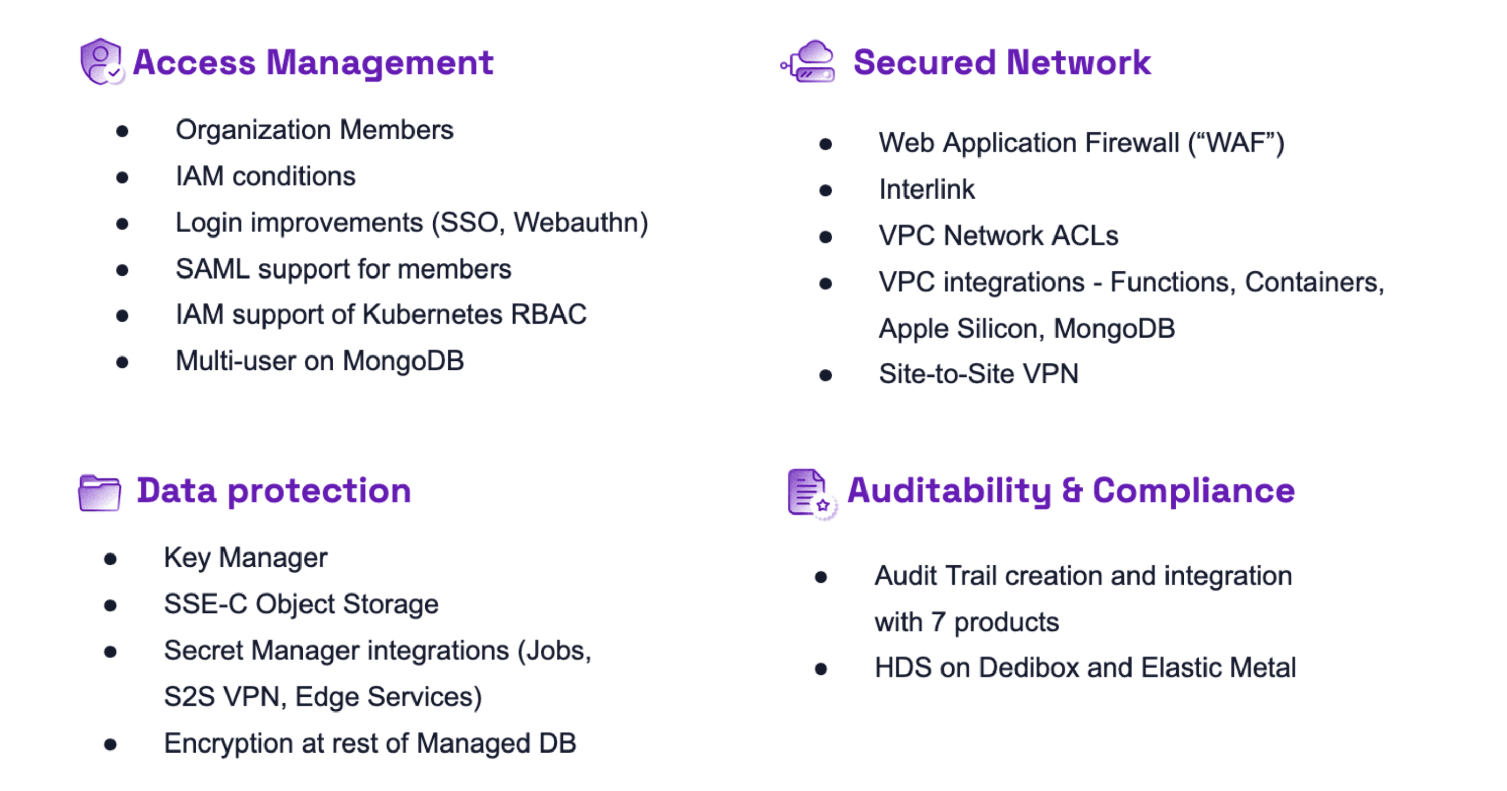 - Secret Manager integrations: Like any good ecosystem products, one of the goals for our Secret Management offer is to get natively integrated with our other products. This year, we released integrations with Serverless Jobs (as the unique way to reference secrets in jobs), Site-to-site VPN (for the pre-shared key) and Edge Services (for the certificate). More info here