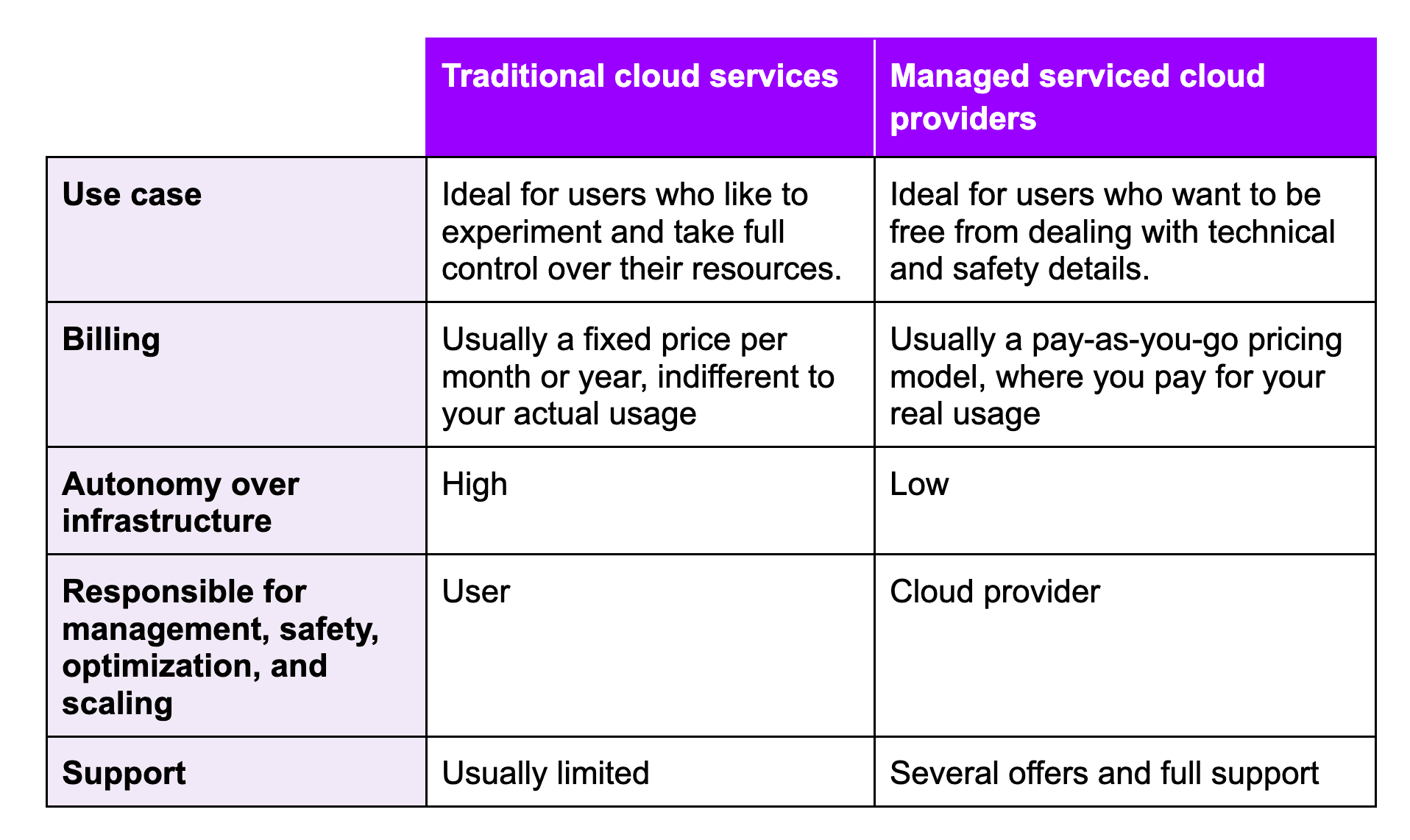 Before diving into details, let’s take a look at the main differences between traditional cloud services and cloud managed services providers (MSPs):