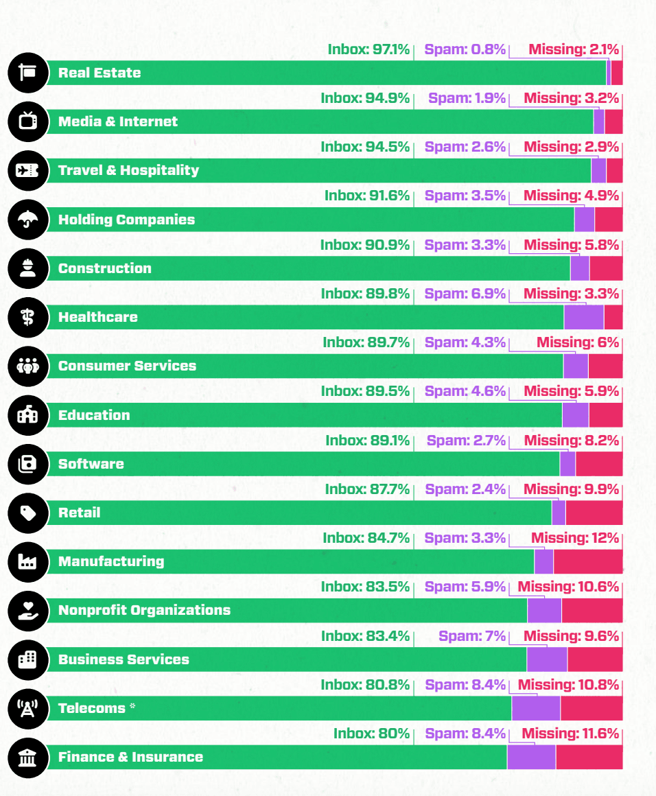 In 2024, nearly one in six marketing emails (about 15%) never reaches the inbox: 6.4% vanish completely, and 8.6% end up in spam folders.