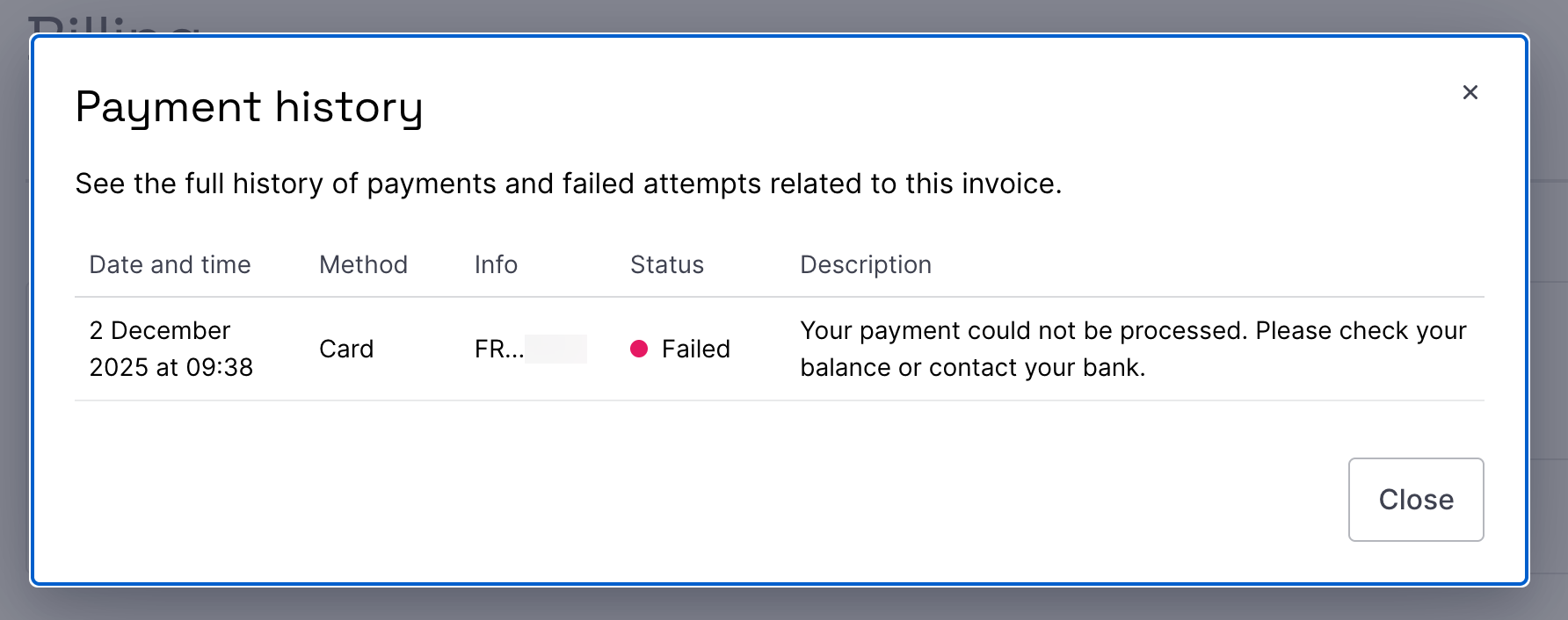 Your payment may have failed due to insufficient funds, an issue with your payment method, or incorrect SEPA mandate details. You can see the details of your payment attempt errors in your invoice history.