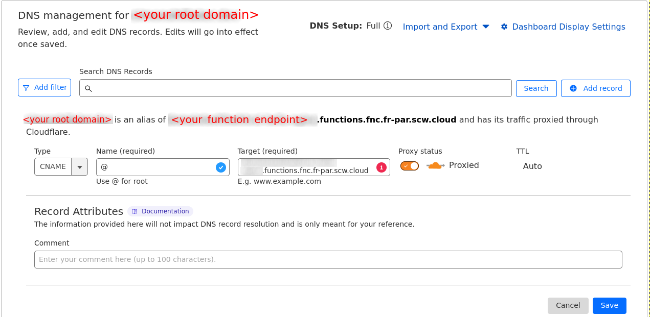 example-website.functions.fnc.fr-par.scw.cloud), and now you want your users to access this version fromhttp://website.mydomain.com
