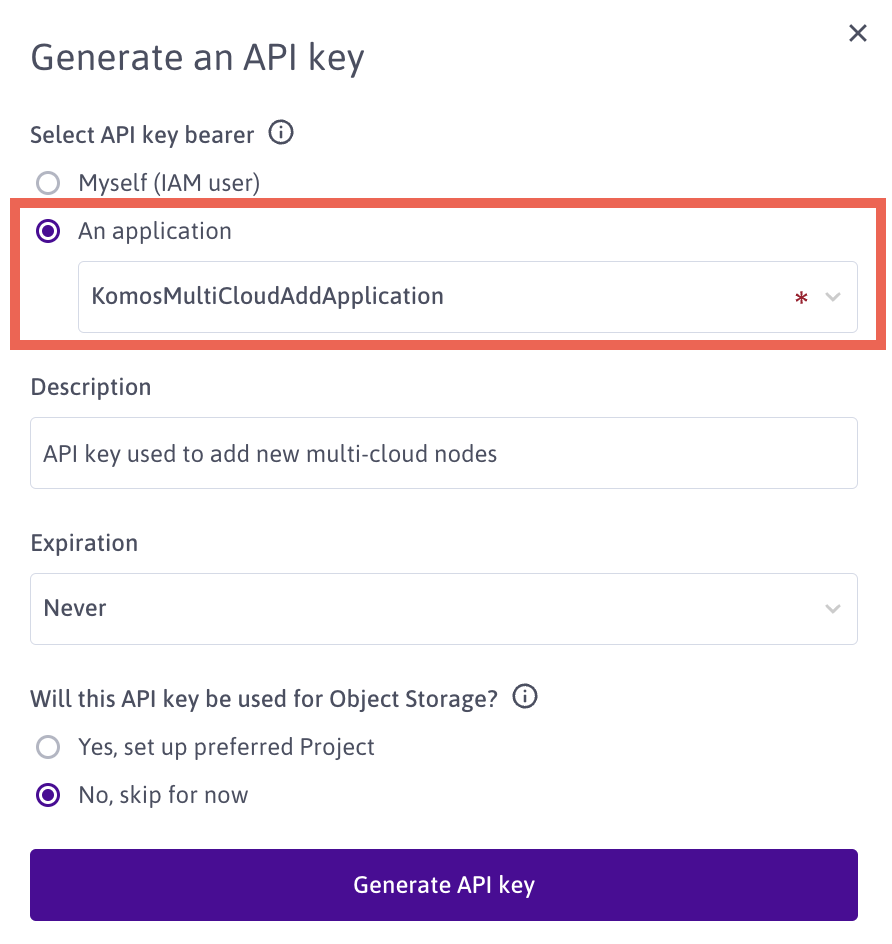 In order to add external nodes to your multi-cloud cluster, you must first create a multi-cloud pool. For security reasons, it is recommended to configure an API key with the KubernetesExternalNodeRegister IAM permission set.