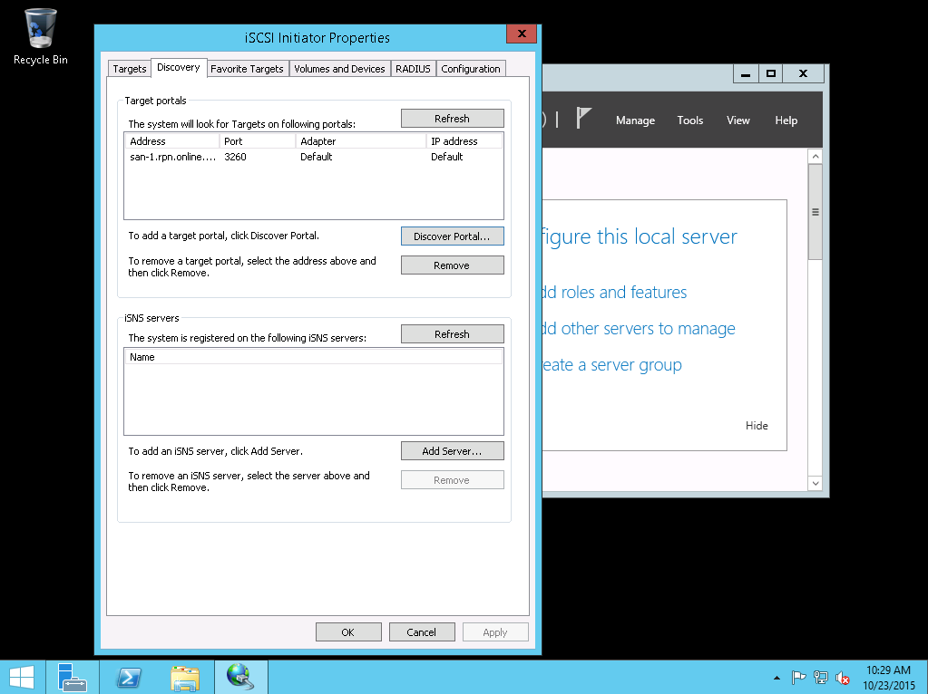 1. Launch the Server Manager application of Windows and click Tools > iSCSI Initiator.