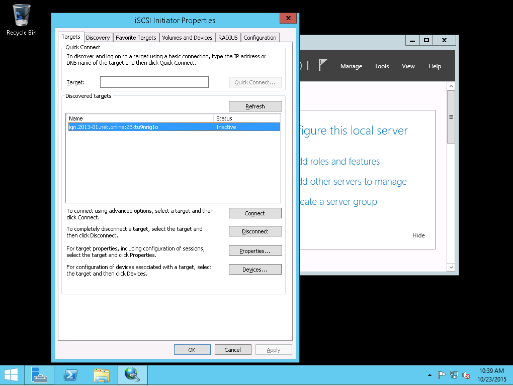 1. Click the Targets tab and select the target you want to connect to. Click Connection to confirm. The target will then be connected to the server as an unformatted disk.