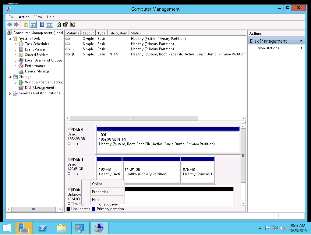 3. The disk can be configured from the Storage > Disk Management section of the Computer Management tool. By default, it displays as offline.