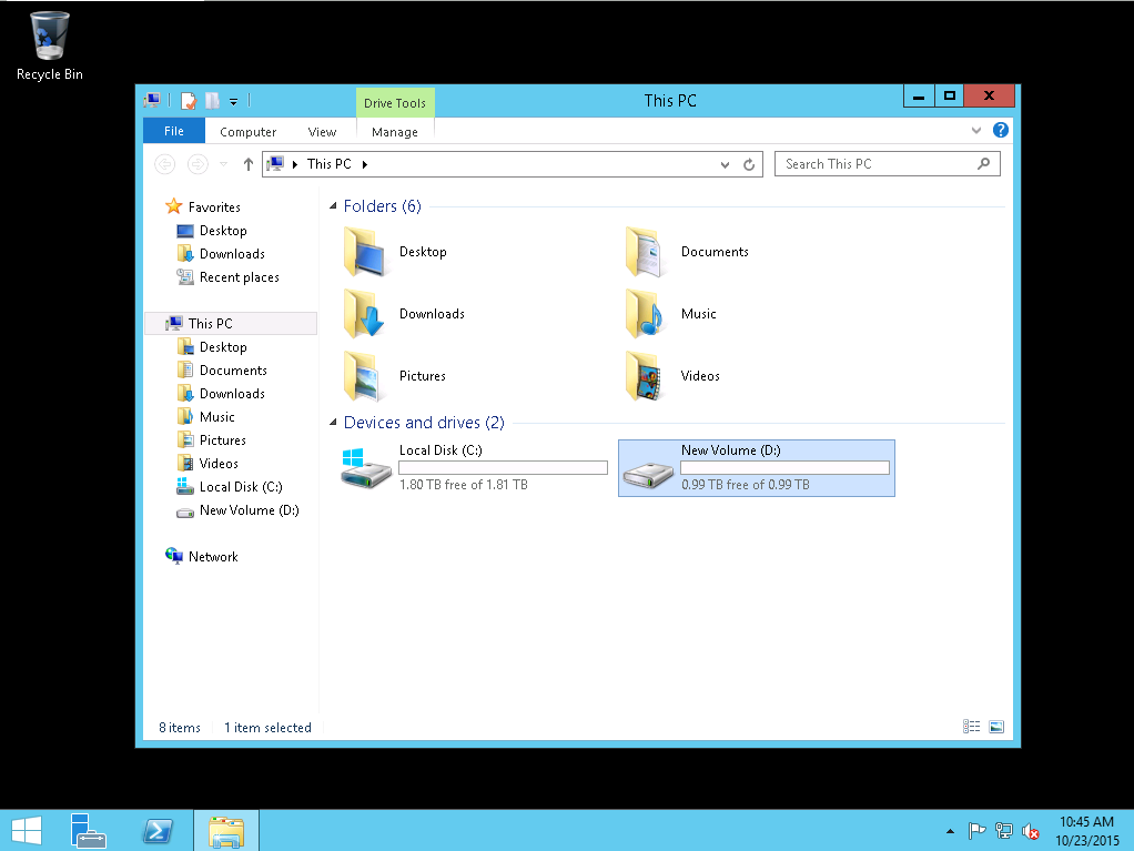 Once finished formatting (in about 10 minutes using quick formatting), the hard disk drive should be accessible from the server manager as a regular disk: