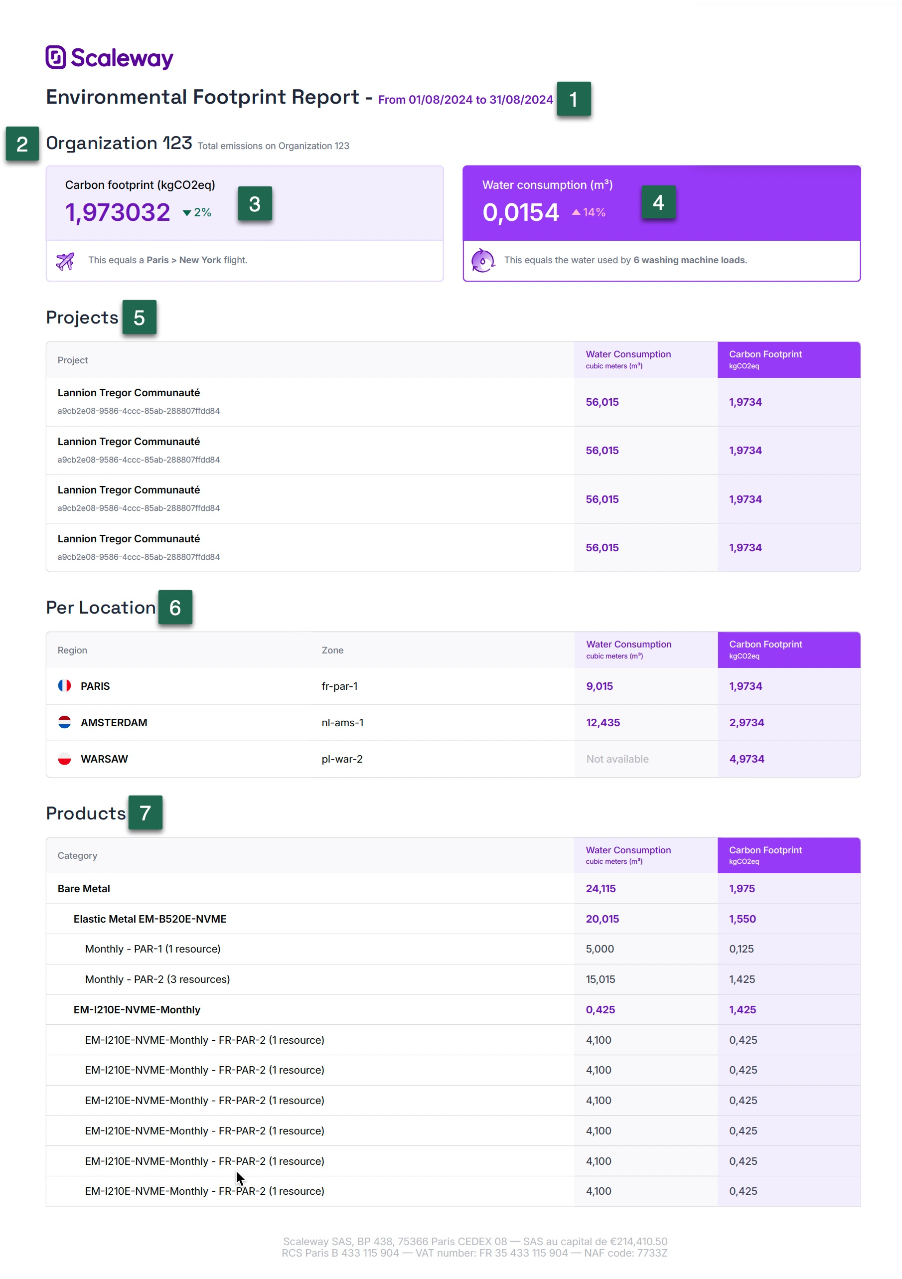 - 3. The total carbon footprint of your Organization per month, which takes into account the impact of the manufacture and use of all the components that run your active Scaleway products in relation to each service's useful life.