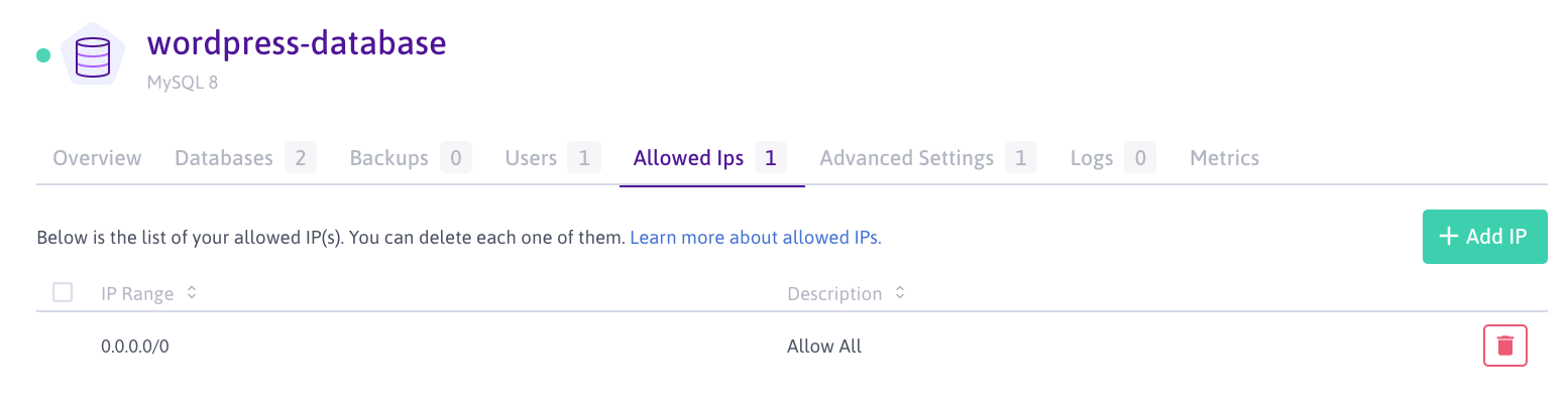 0.0.0.0/0 Allow All). - Click Add IP and enter the IP of your Instance in CIDR notation (for example: