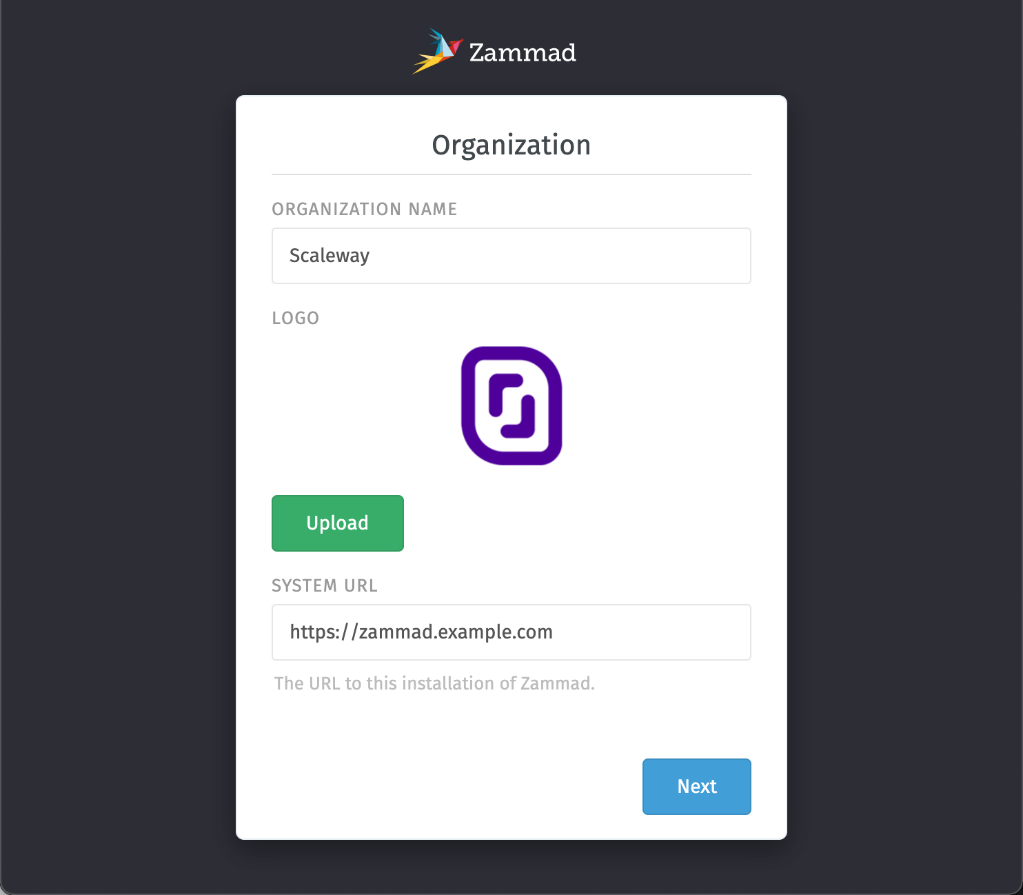 - Enter the required information about your organization. You can upload your company logo to customize the installation. Make sure the System URL corresponds with your domain name (