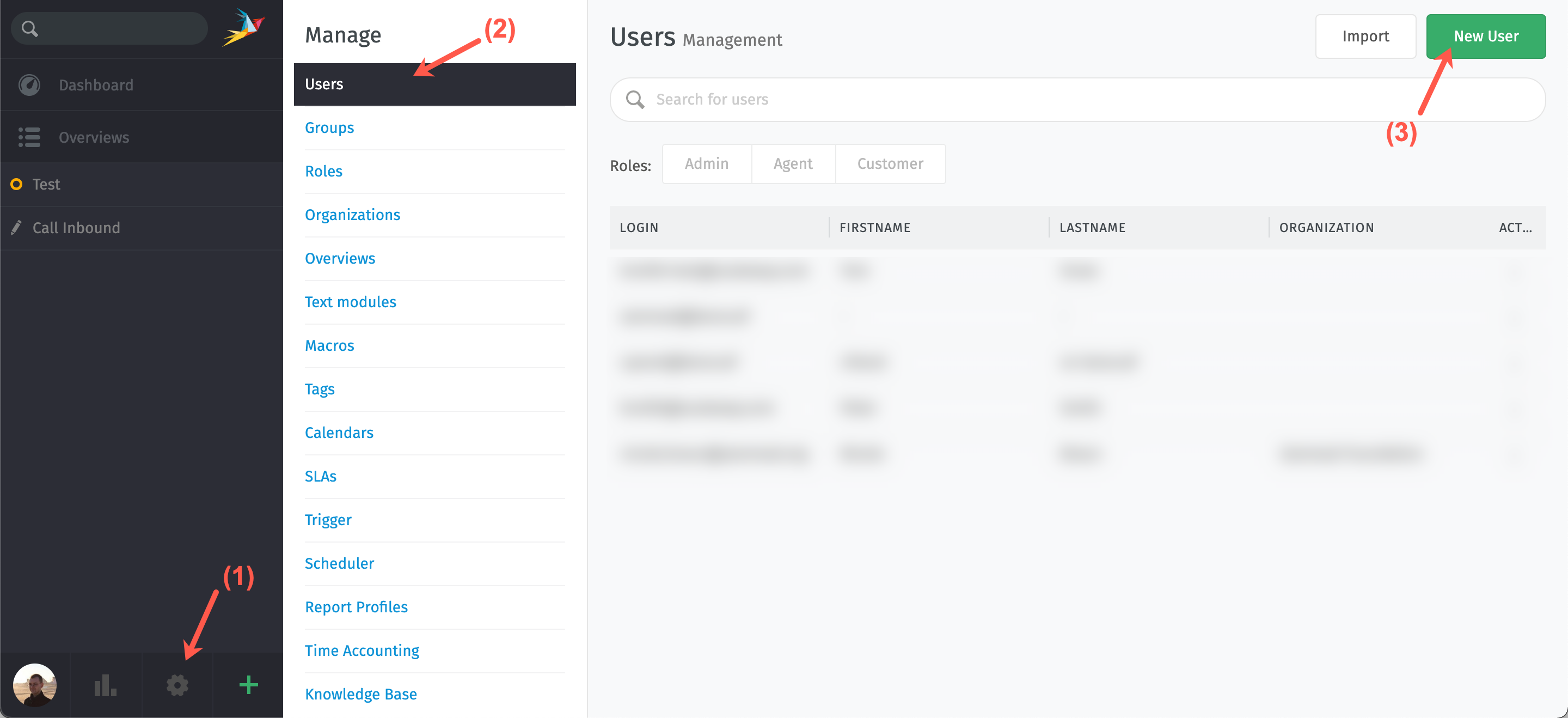- Click the cogwheel icon (1) to enter the management section of Zammad.