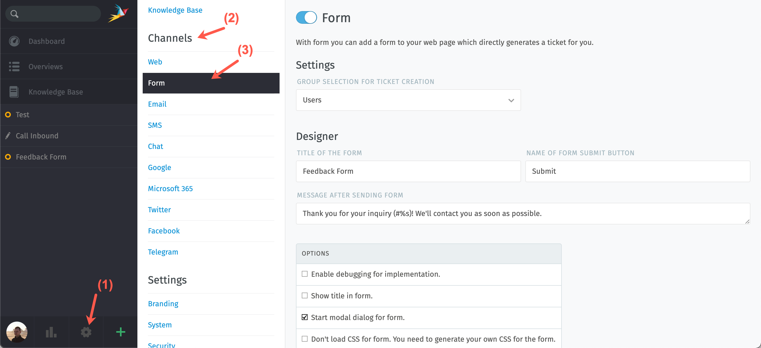 - Scroll down to the Channels section (2) and choose the communication channel you want to configure (3).