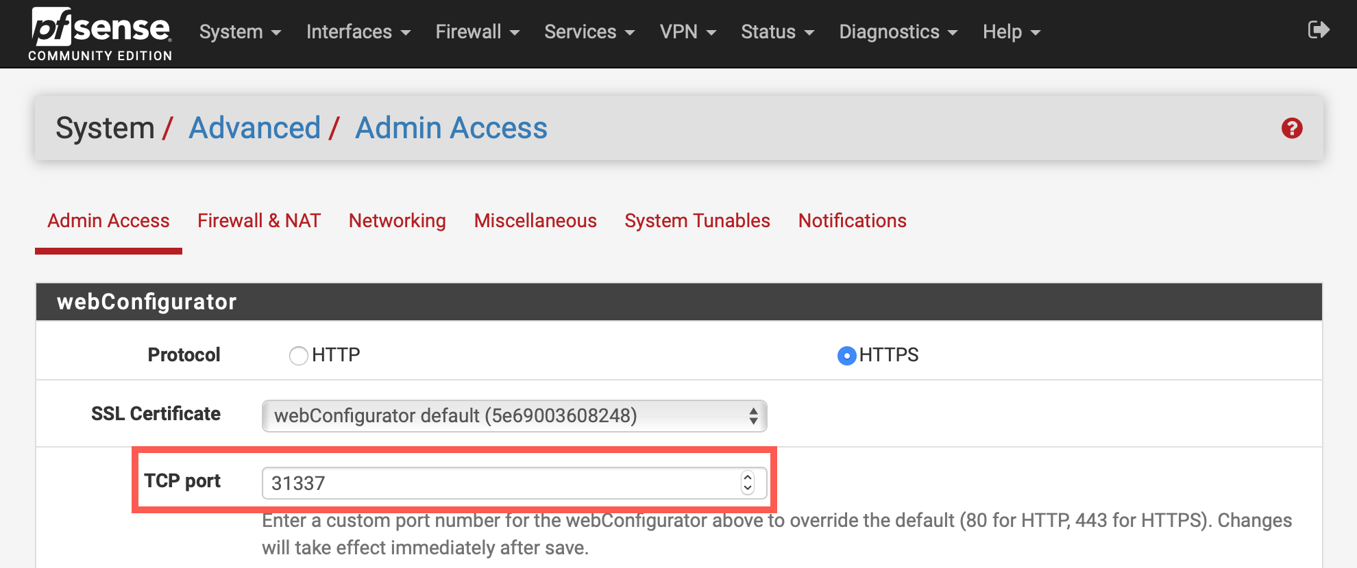 Go to System > Advanced and change the TCP port in the WebConfigurator settings to