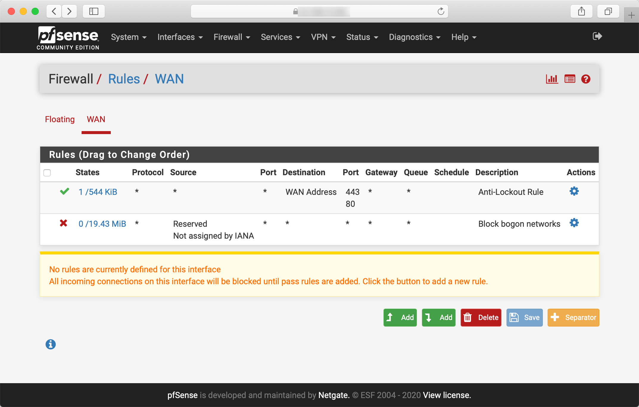 You can see the Anti-Lockout Rule, which allows the connection to the web interface in the current state of the firewall. This rule will be deleted once the LAN interface is set up.