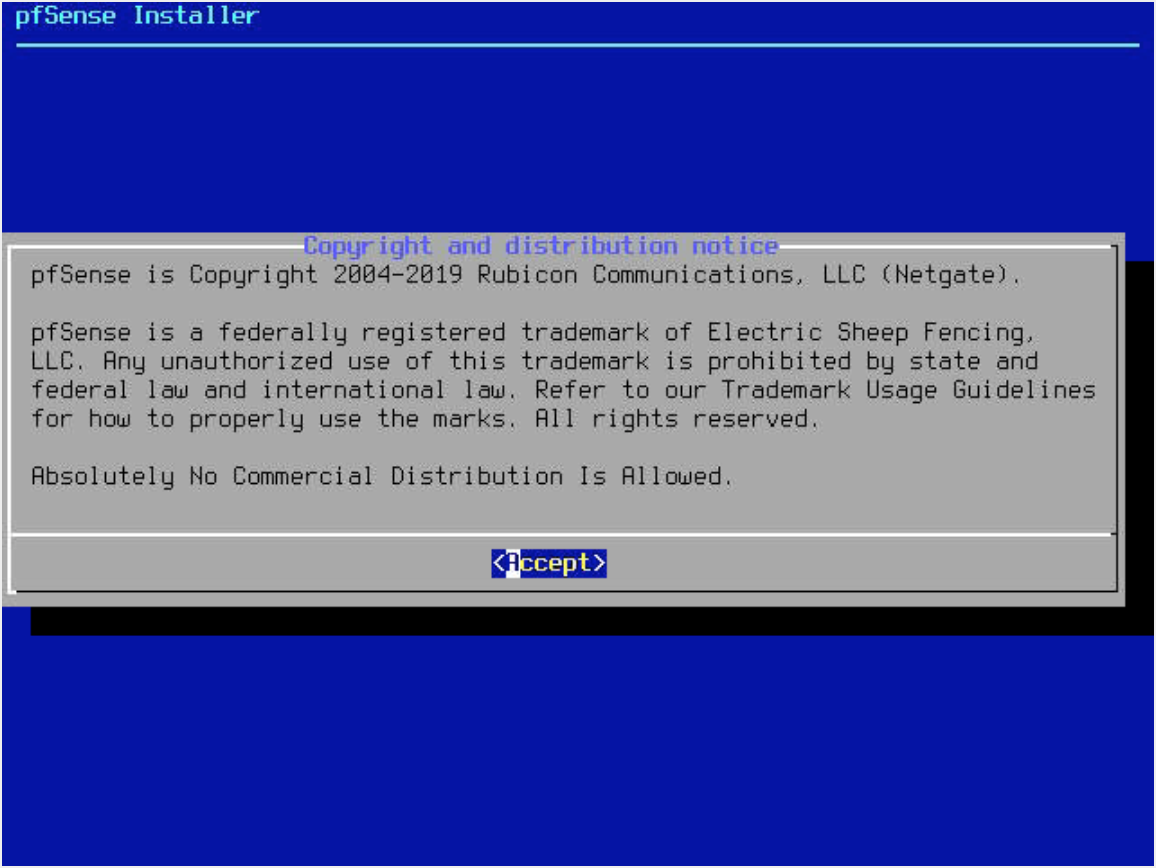 The pfSense install wizard displays. Accept the copyright and distribution notice by pressing the Enter key on your keyboard: