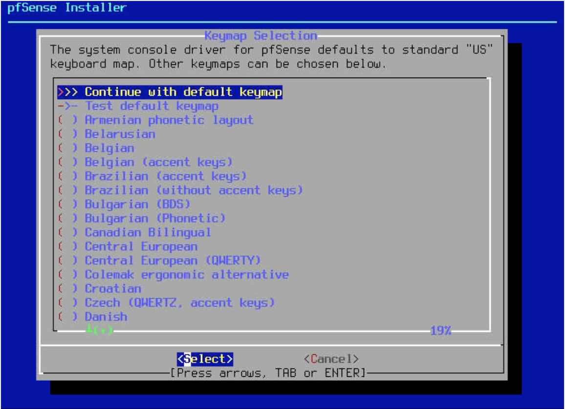 Choose the keymap for your pfSense installation. By default, the
