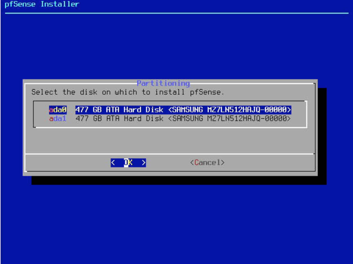 Choose the disk to install pfSense on. If your server has more than one disk, choose