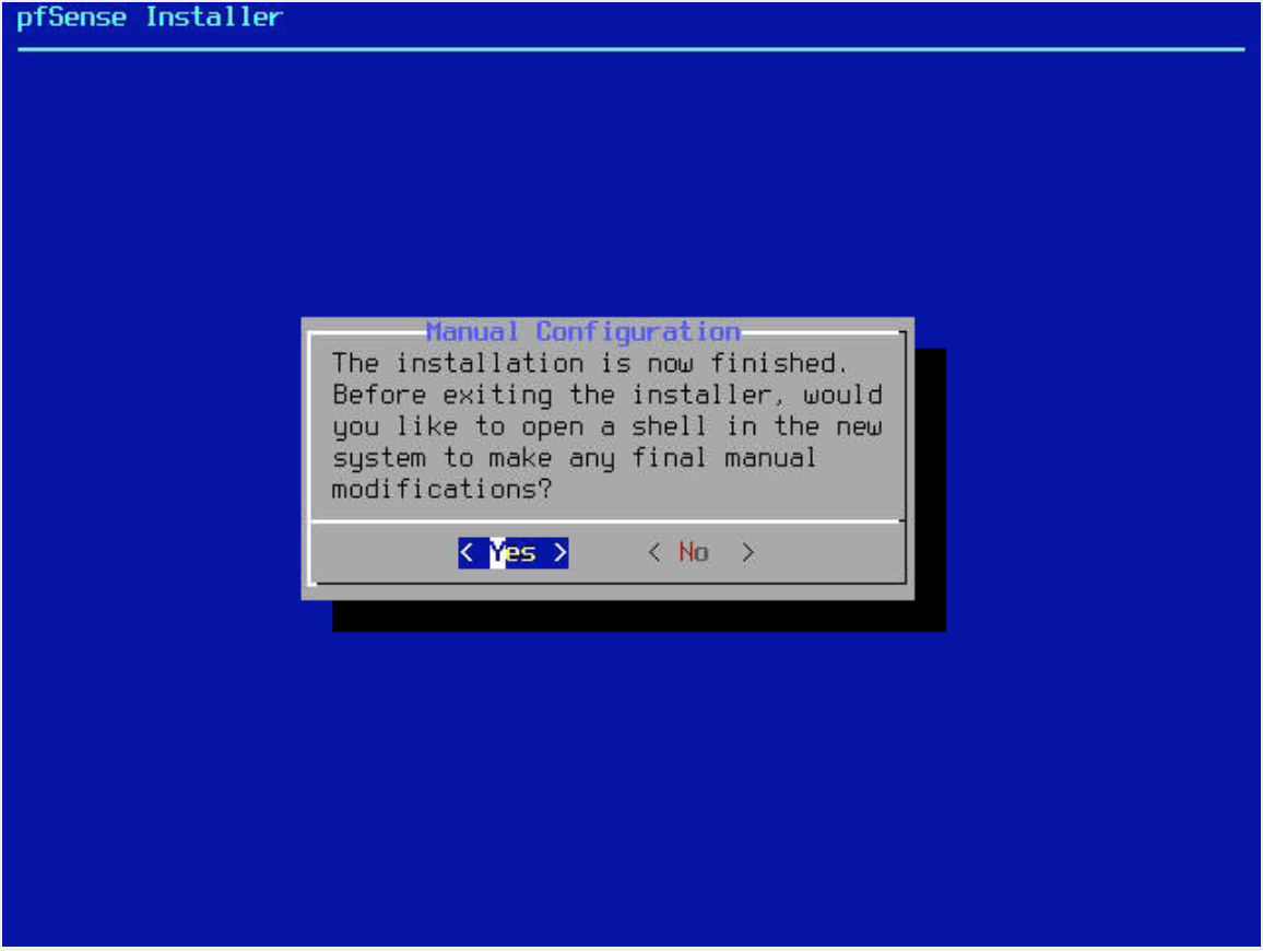 The automatic installation finishes. Choose Yes and confirm by pressing Enter to open a shell in the newly installed system to run a manual configuration: