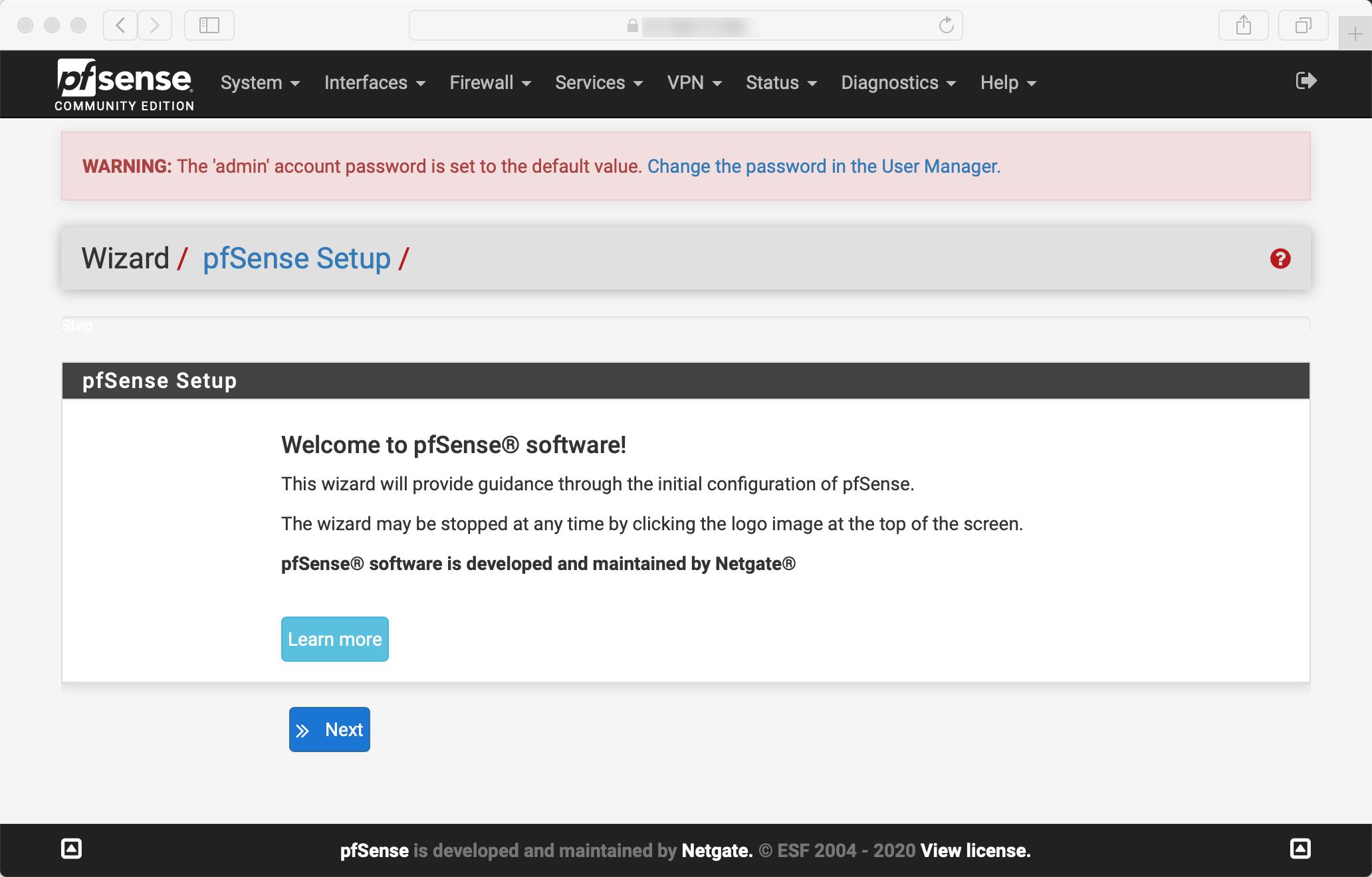 Once logged in, the pfSense setup wizard displays: