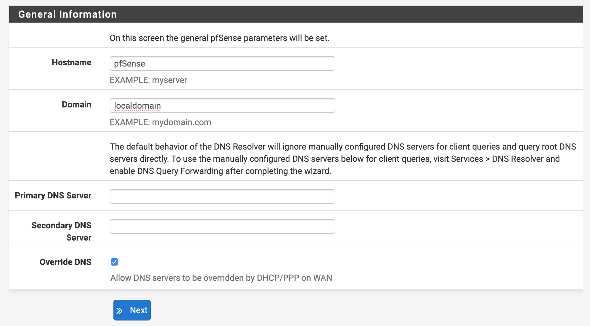 Enter general information about the pfSense server. These include the Hostname and the Domain of the server. Leave Primary DNS Server and Secondary DNS Server empty and the option Override DNS checked. Click Next to continue: