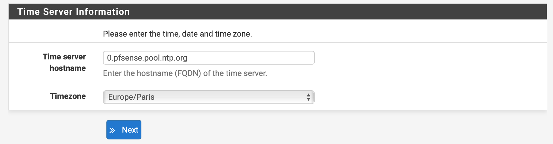 Configure the NTP Time Server. You can leave the default value and set the Timezone to Europe/Paris, then click Next to continue: