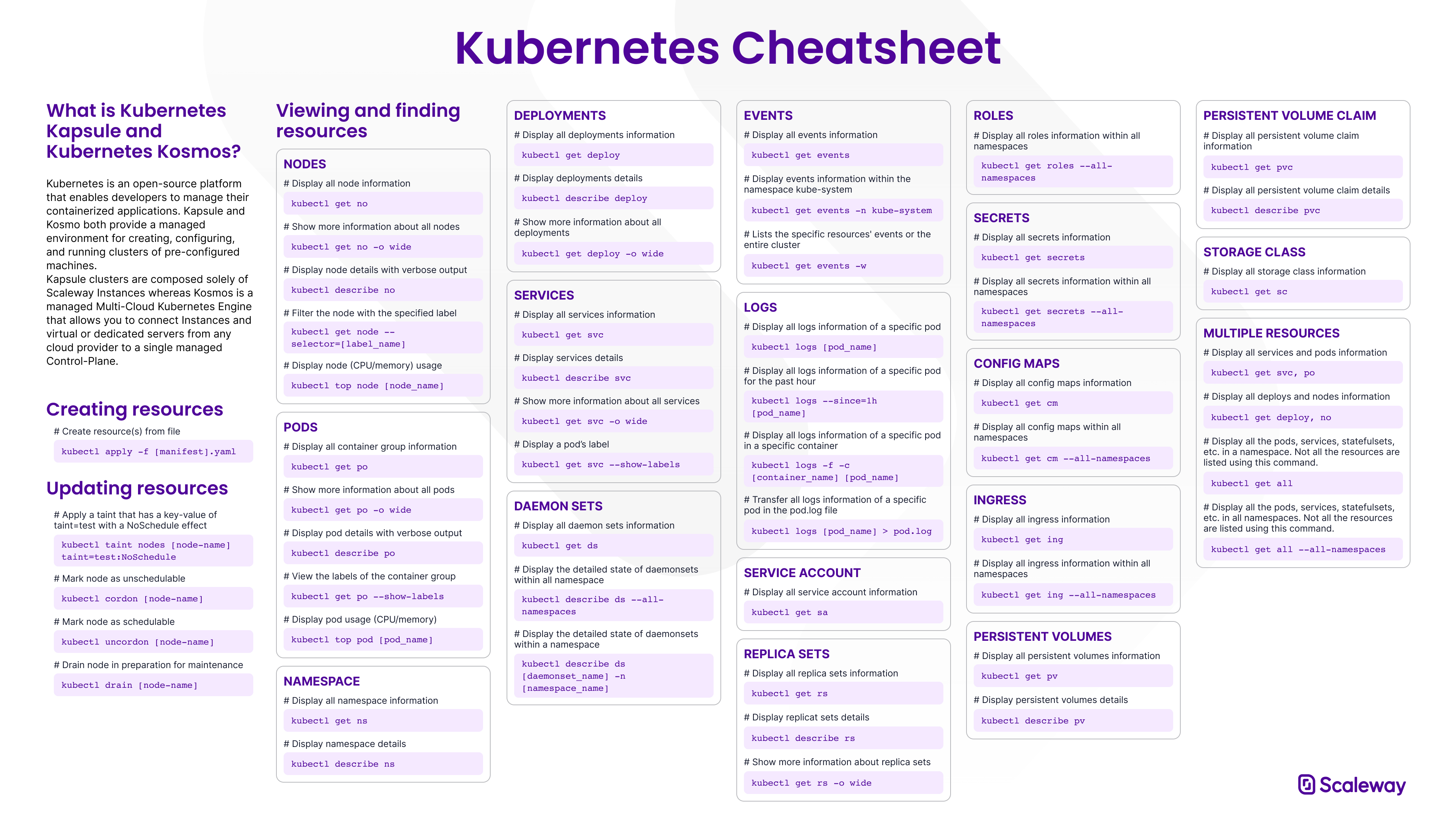 This page shows the most common kubectl commands for creating and managing Scaleway Kapsule and Kosmos clusters.