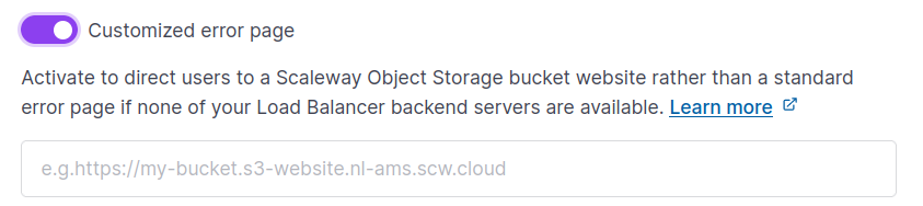 - Slide the toggle icon toggle to activate the customized error page feature, and enter a Scaleway Object Storage Bucket Website URL in the box. Note that the URL of the bucket endpoint is not sufficient, the bucket website domain is specifically required, without a leading protocol (no