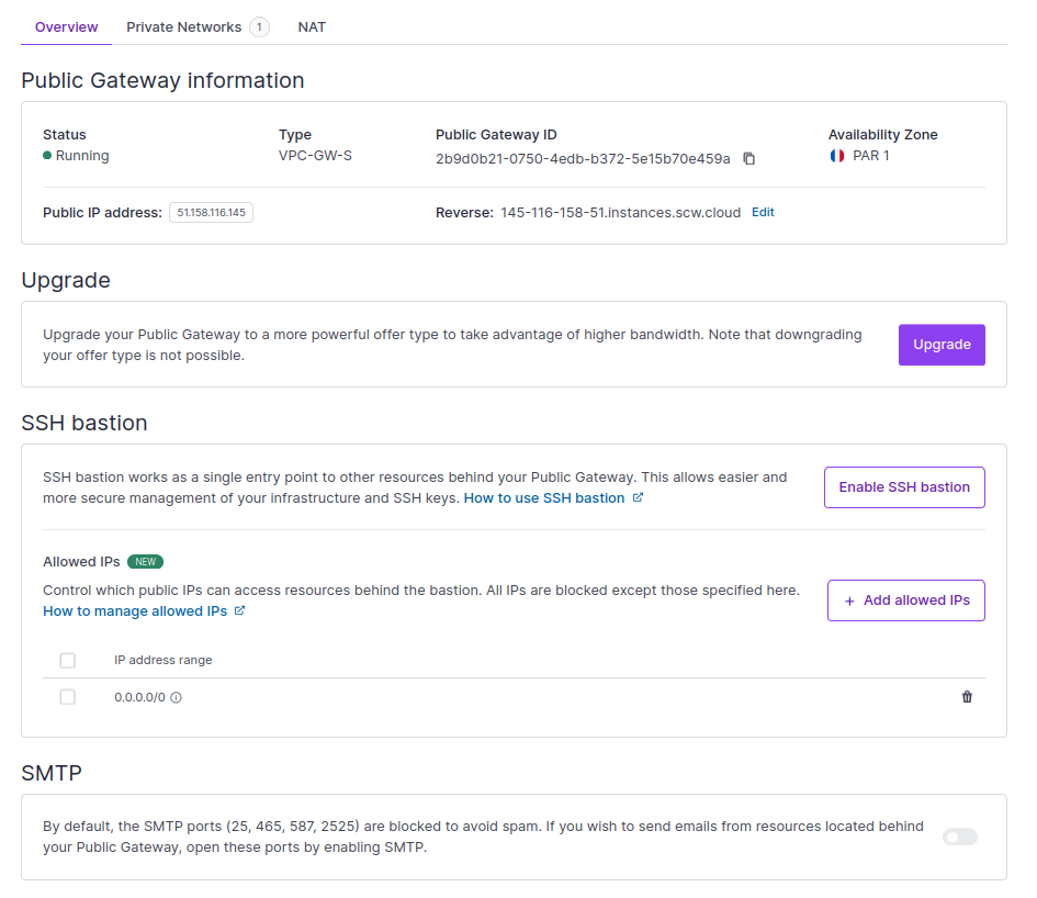 You are redirected to your Public Gateway's Overview page, where SSH bastion is now activated. All the SSH keys in your Project at the time of activation are copied to the SSH bastion.