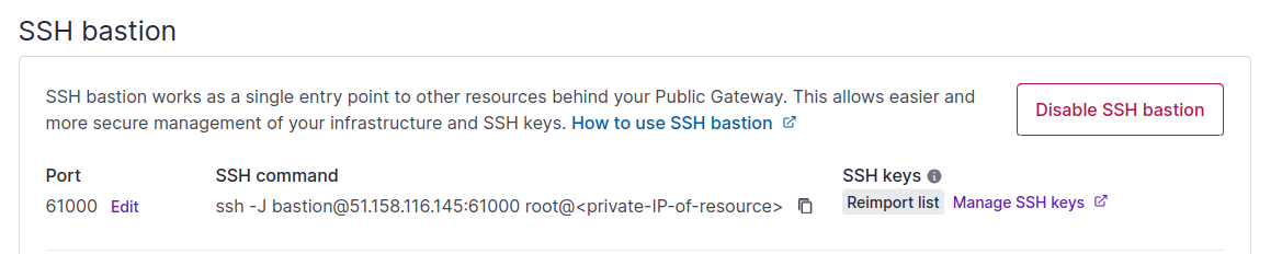 SSH bastion is a server dedicated to managing connections to the infrastructure behind your Public Gateway. When you activate SSH bastion on your Public Gateway, all SSH keys held in your Project are imported to the SSH bastion, providing a single point of entry. You can then connect to resources connected to the same Private Network as the Public Gateway, via the bastion. This makes management of your infrastructure easier and more secure, as you do not need to expose your other resources to the internet in order to connect to them, neither do you need to upload SSH keys to individual resources.
