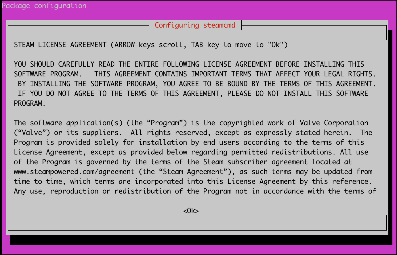 multiverserepository and thei386architecture are required. Configure these settings and update theaptpackage manager before installing the SteamCMD client:add-apt-repository multiverse dpkg --add-architecture i386 apt update apt install lib32gcc1 steamcmd -yDuring installation, you are requested to agree to Steam's license agreement. Use the Tab key to move to OK, then press Enter to accept the terms:
