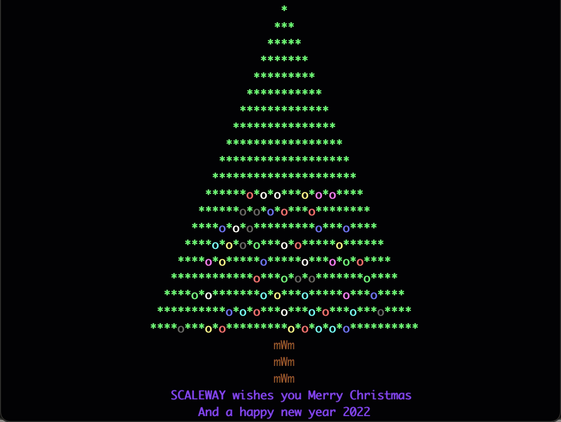 # The following line tells the shell what program to interpret the script with #!/bin/bash # tput is a command to manipulate the terminal, it can be used to change the color of text, apply effects, and generally brighten things up. trap "tput reset; tput cnorm; exit" 2 clear tput civis lin=2 col=$(($(tput cols) / 2)) c=$((col-1)) est=$((c-2)) color=0 # Set the text color to green to write the tree tput setaf 2; tput bold # Write the tree for ((i=1; i<40; i+=2)) { tput cup $lin $col for ((j=1; j<=i; j++)) { echo -n \* } let lin++ let col-- } ## Set the color to brown for the trunk tput sgr0; tput setaf 130 # Write the Trunk in three lines for ((i=1; i<=3; i++)) { tput cup $((lin++)) $c echo 'mWm' } # Write a greeting tput setaf 93; tput bold tput cup $lin $((c - 15)); echo SCALEWAY wishes you Merry christmas tput cup $((lin + 1)) $((c - 11)); echo And a Happy New Year 2026 let c++ k=1 # Configure lights and decorations while true; do for ((i=1; i<=35; i++)) { # Turn off the lights [ $k -gt 1 ] && { tput setaf 2; tput bold tput cup ${line[$[k-1]$i]} ${column[$[k-1]$i]}; echo \* unset line[$[k-1]$i]; unset column[$[k-1]$i] # Array cleanup } li=$((RANDOM % 9 + 10)) start=$((c-li+2)) co=$((RANDOM % (li-2) * 2 + 1 + start)) tput setaf $color; tput bold # Switch colors tput cup $li $co echo o line[$k$i]=$li column[$k$i]=$co color=$(((color+1)%8)) } k=$((k % 2 + 1)) done - Paste the copied file and press