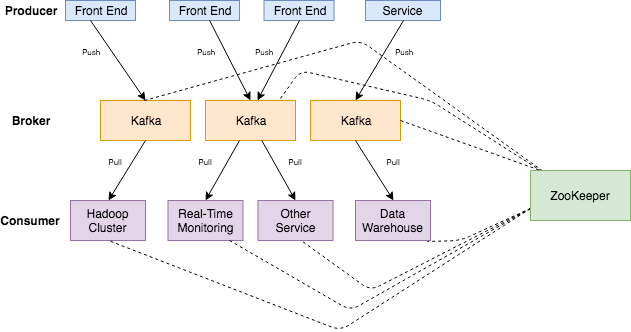 Brokers collect the messages sent by the producers. A message can be any kind of data and can be reported from different types of services, either log files or data collected by a sensor probe.