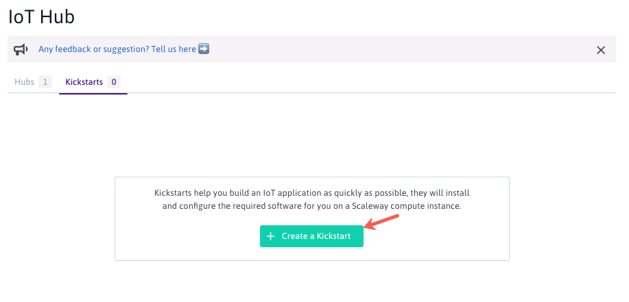 Go back to your IoT Hub in the Scaleway console and click on the Kickstart tab. Click Create a Kickstart: