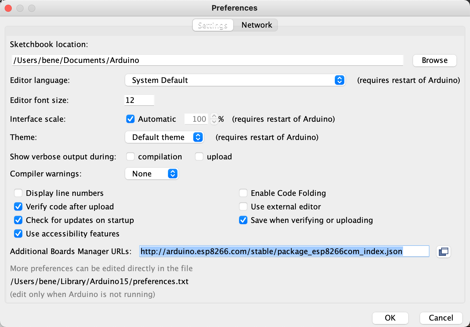 http://arduino.esp8266.com/stable/package_esp8266com_index.jsonand click OK to validate: