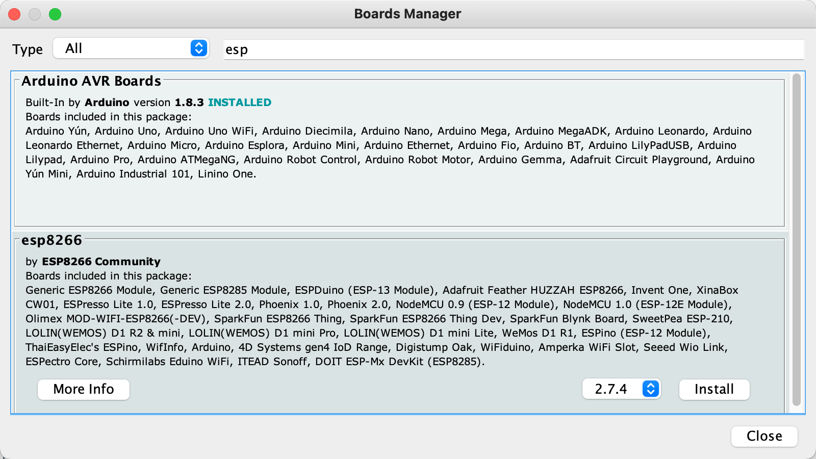 espin the search bar and install the esp8266 boards package. Then close the window.