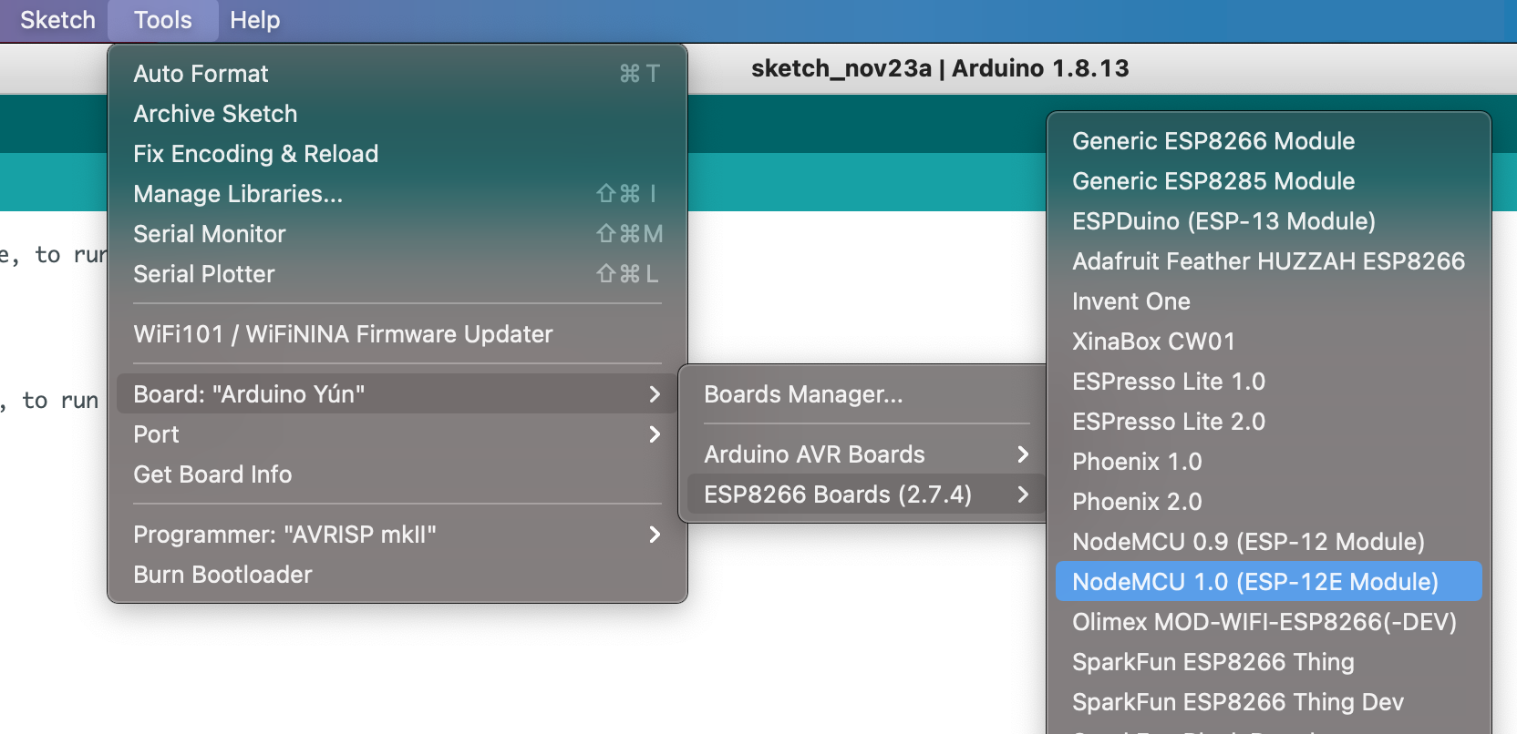 - Enter the Tools menu, then Board and select NodeMCU 1.0 (ESP-12E Module).