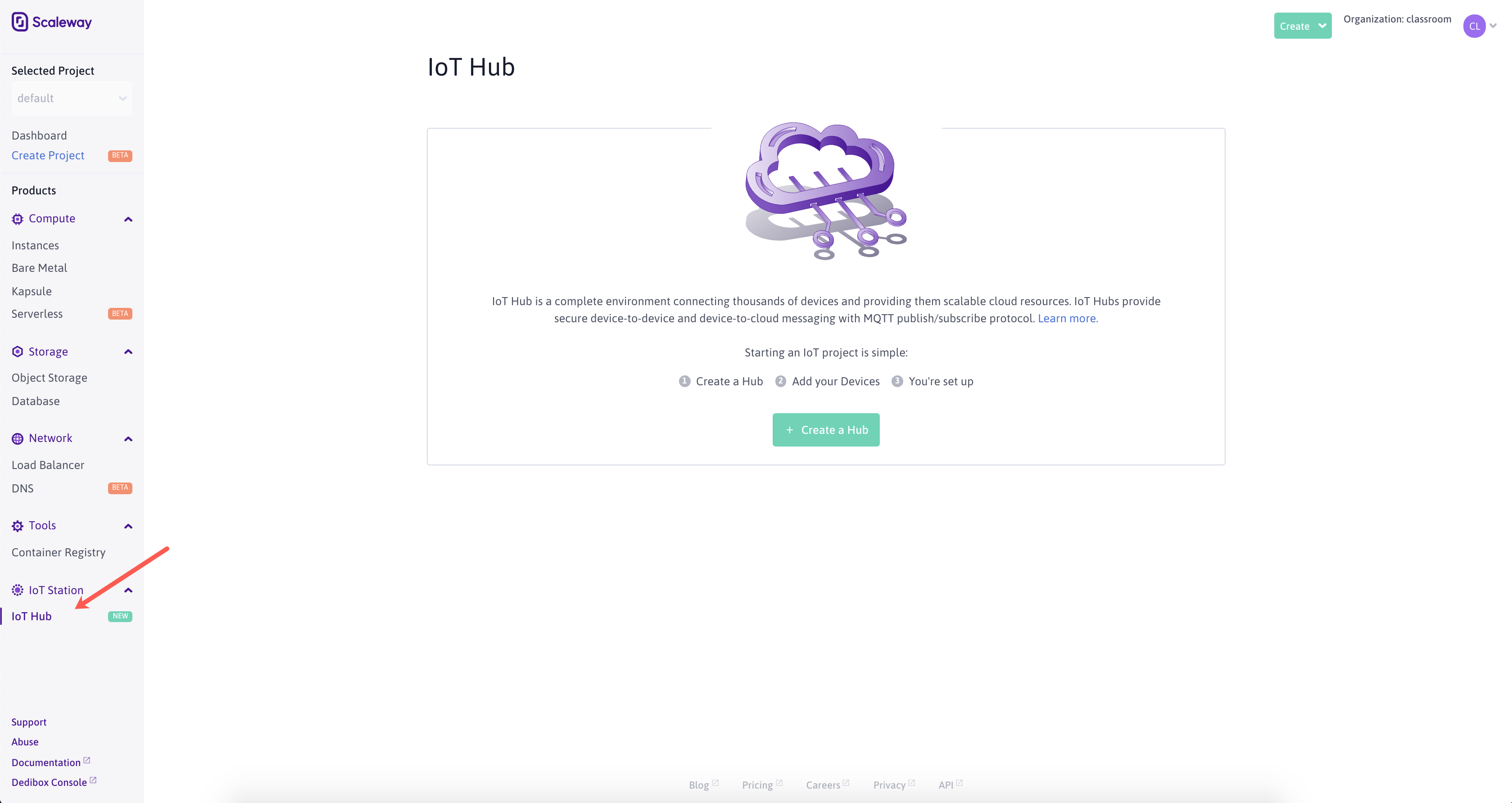 - Log into your Scaleway console and click on IoT Hub in the side menu: