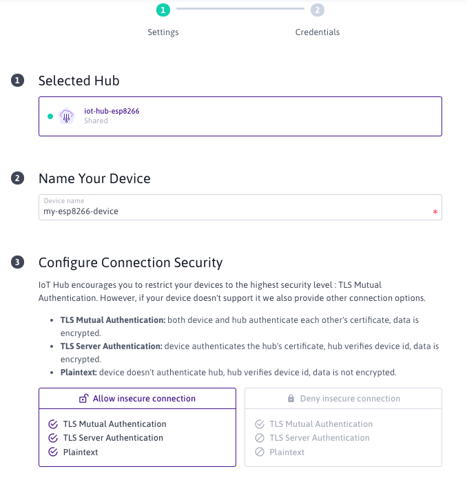 - Navigate to the Devices tab and click Add device to add a new device to the hub: