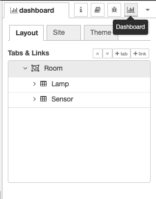 Your IoT Kickstart application is deployed. The deployment may take some seconds, once it is ready, a green dot appears next to it. Click Dashboard to access the Node-RED dashboard: