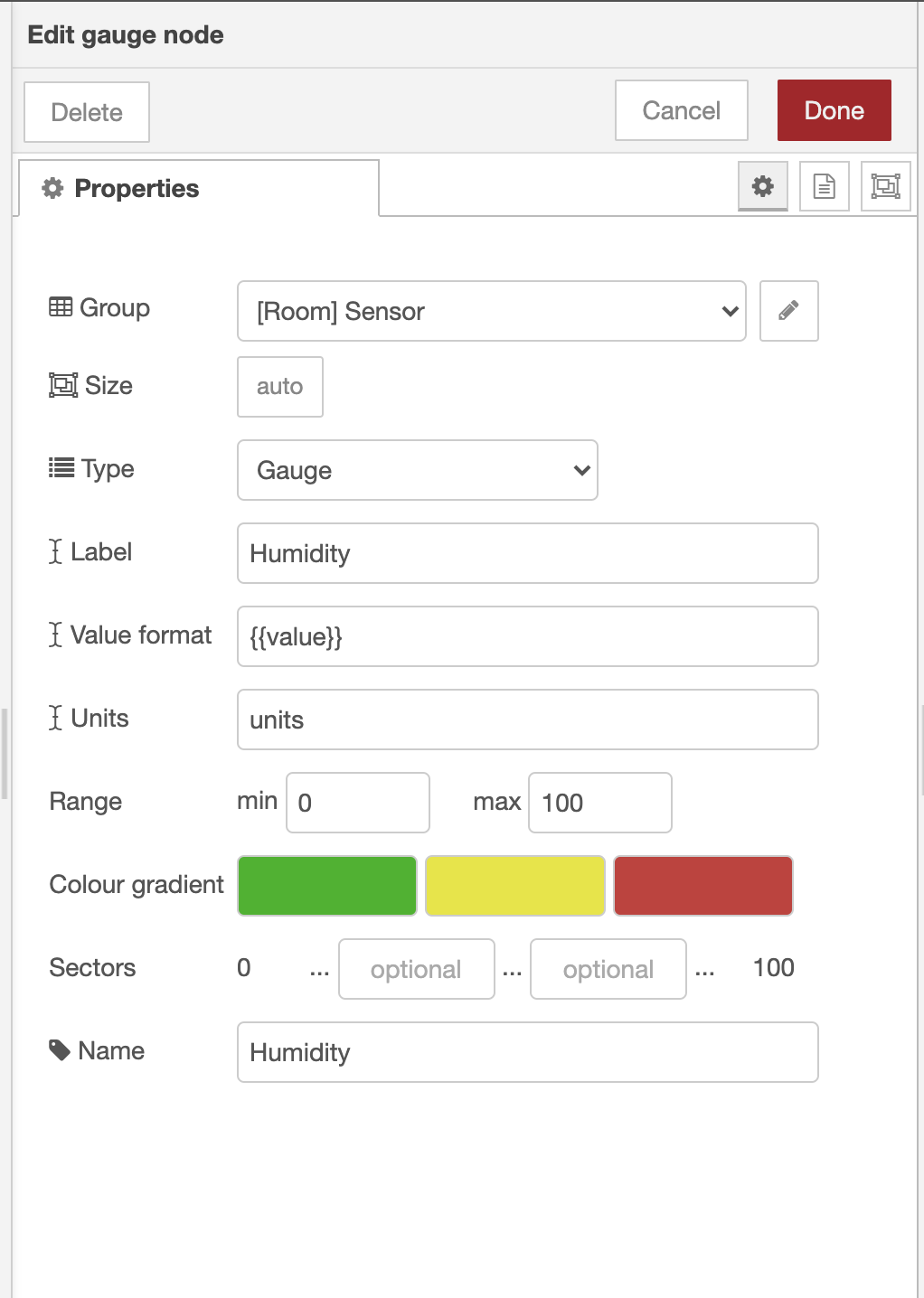 mqtt input nodes– these nodes subscribe to the temperature and humidity topics to receive sensor data from the ESP chart– will display the temperature sensor readingsgauge– will display the humidity sensor readings