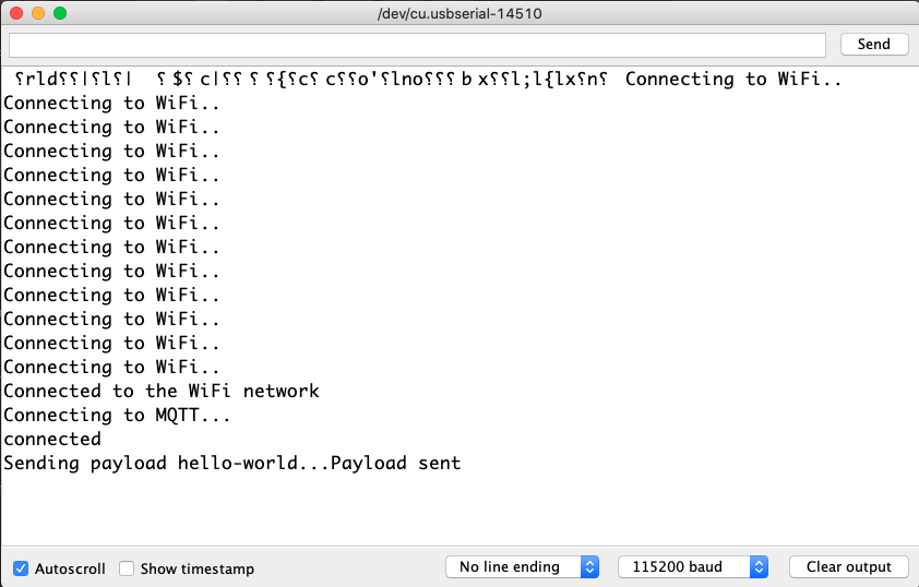 Serial.println("Sending payload hello-world..."); client.publish("esp/test", "hello-world"); //Topic name Serial.println("Payload sent!"); client.subscribe("esp/test"); } -