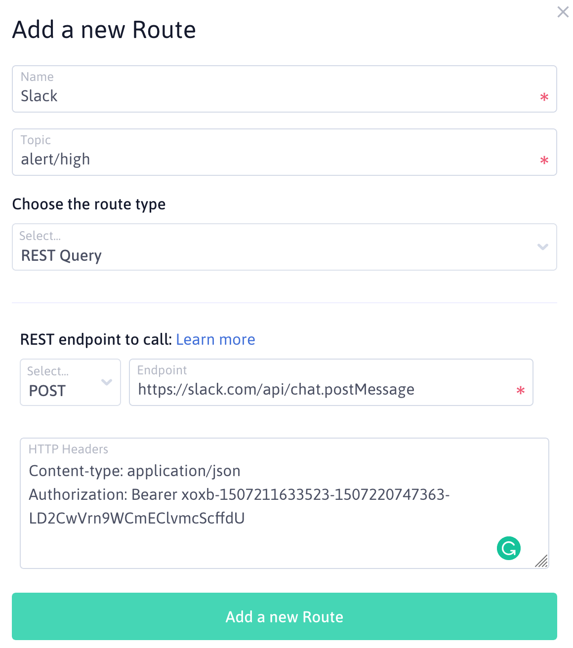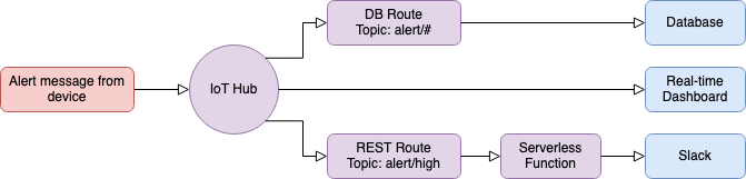 Here is where the magic happens: We will instruct our IoT Hub to call our Slack application when a message is published on the alert/high topic. To do so we will use an IoT Hub REST Route.