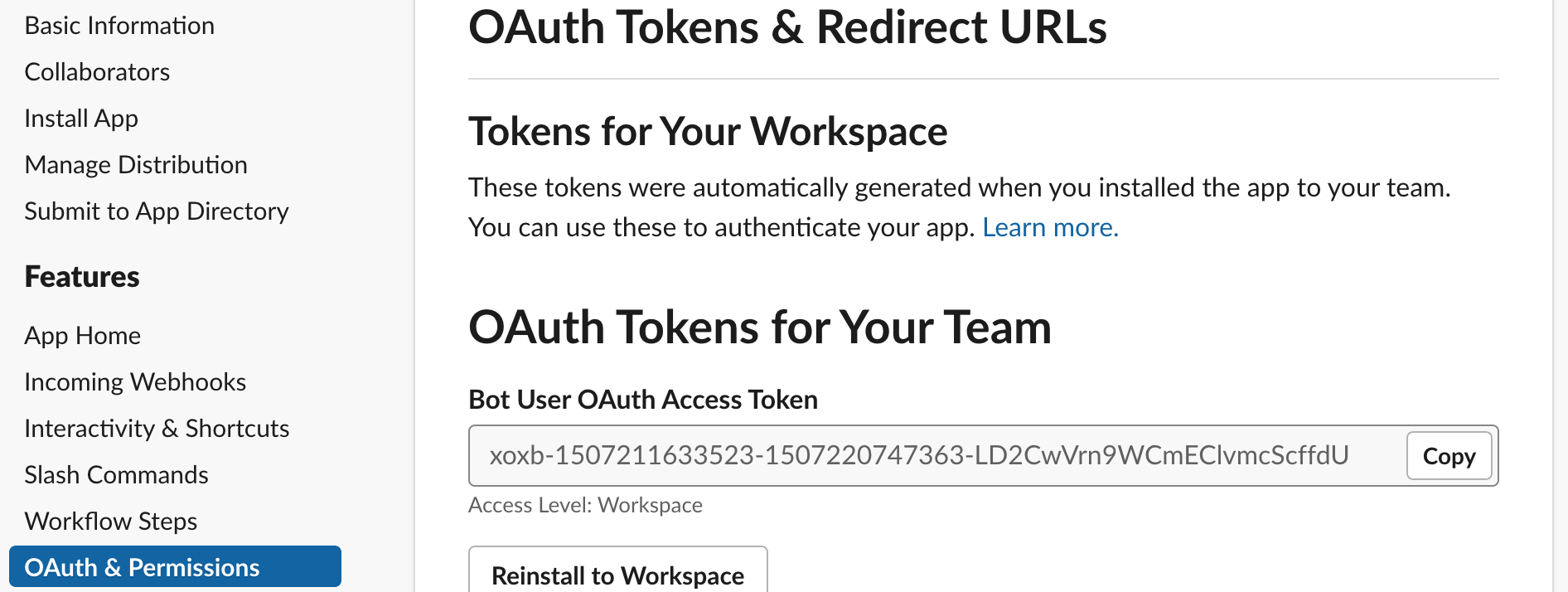 OAuth & Permissionspage, underScopes > Bot Token Scopes, and add an OAuth scope namedchat:write. It should look like the following.