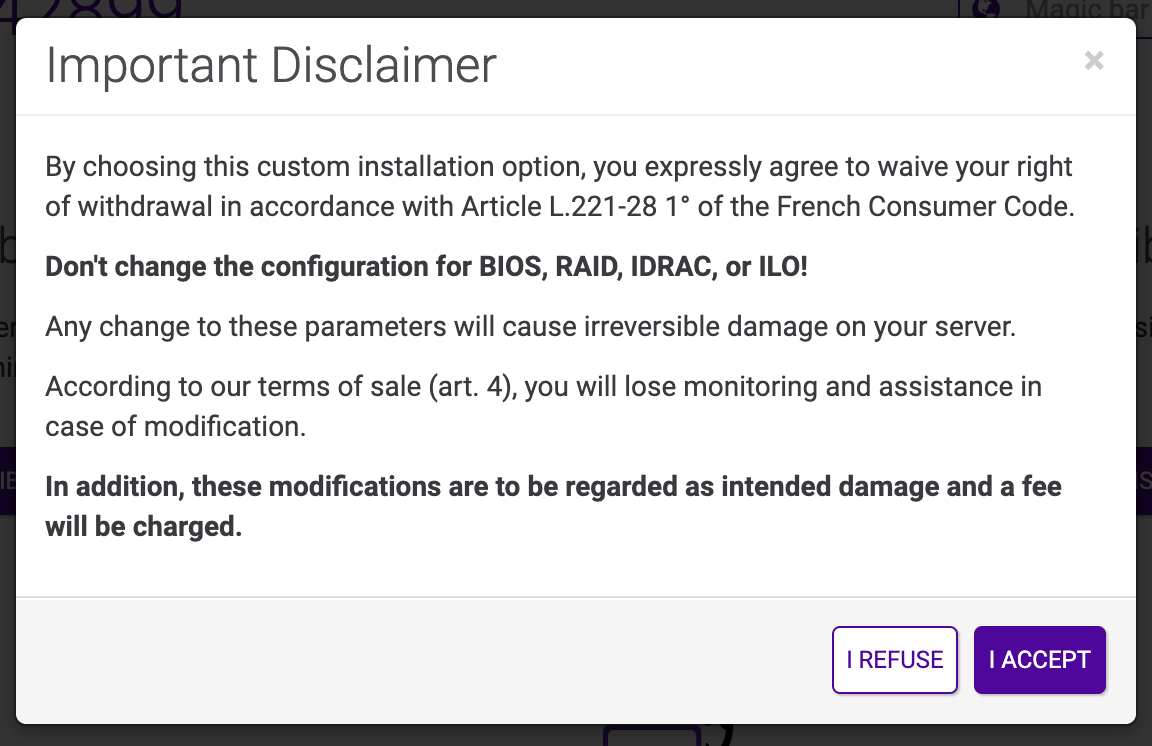 Your server can also be booted from an ESXi ISO file through a KVM over IP device if included in your Dedibox. This type of installation gives you the possibility of installing your own licenses or remote ISO files.