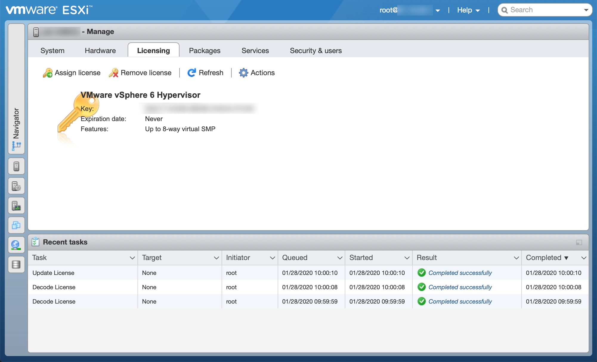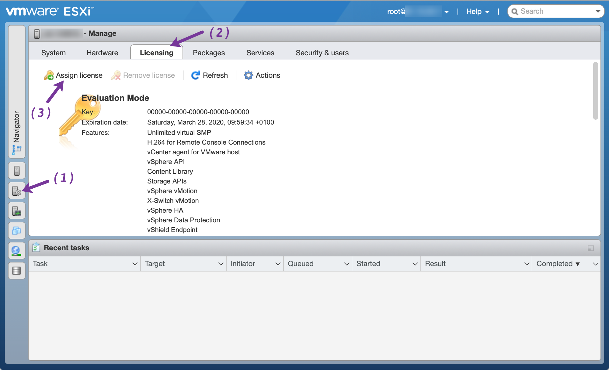 Click Manage (1), then Licensing (2) followed by Assign License and enter the license code for ESXi. A free ESXi license can be obtained directly from VMware.