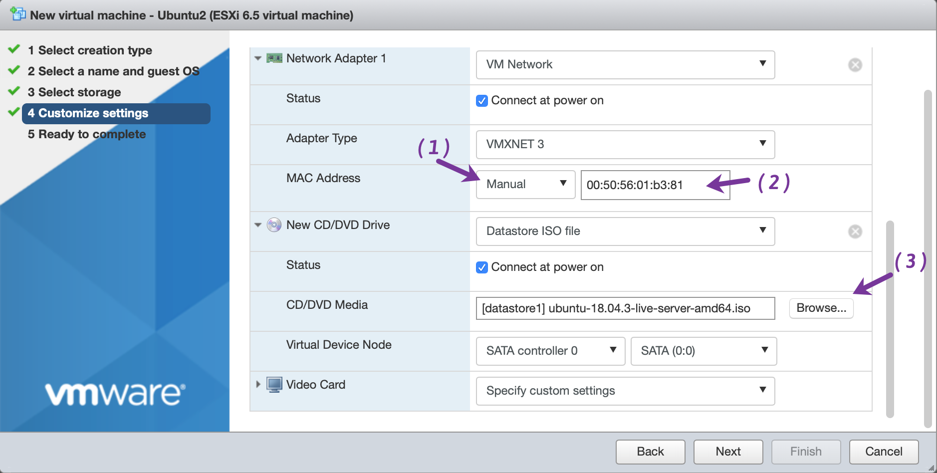 The virtual machine settings display. 5. Set the amount of RAM and CPU cores according to your requirements. Click Add other device and choose CD/DVD drive from the list of options. 6. Click the Network Adapter 1 to display the advanced settings. Set the Mac Address settings to Manual (1) and enter the virtual MAC address (2) associated with the failover IP of the virtual machine. Click New CD/DVD Drive to display the advanced settings. Choose Datastore ISO file from the drop-down menu. Click Browse (3) in the CD/DVD Media section to select the ISO file containing the operating system installer.