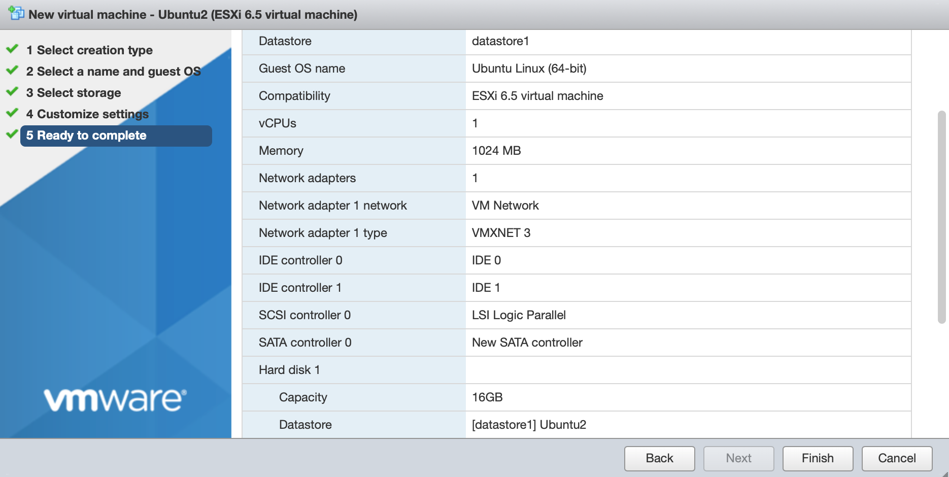 A summary of the configuration displays. 7. Click Finish to start the creation of the virtual machine and to leave the configuration wizard:
