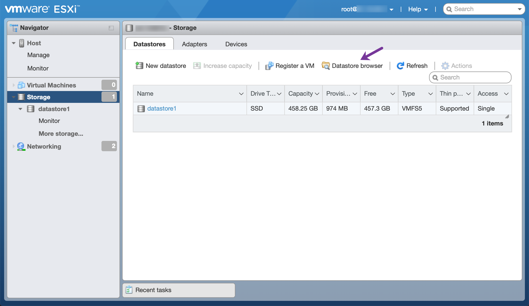 - From the ESXi dashboard, click Storage to view the storage dashboard. Click Datastore Browser to display the datastore content: