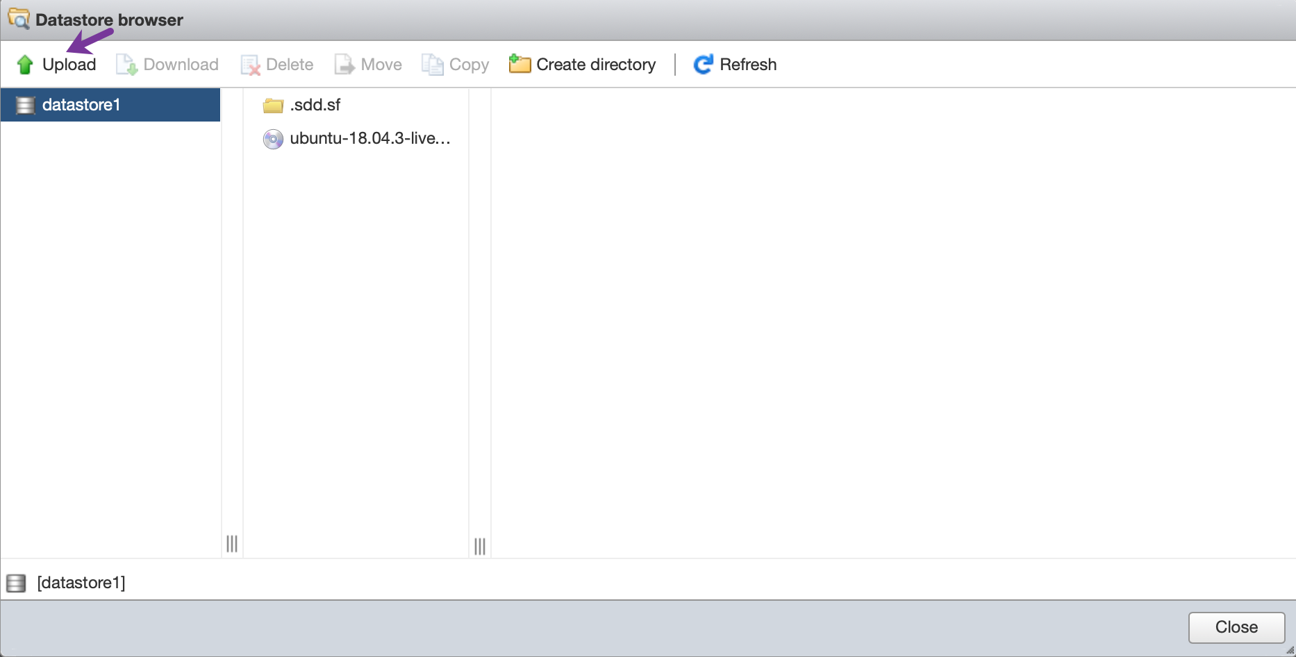 - Click Upload and choose an ISO file on your local computer to upload it to the datastore: